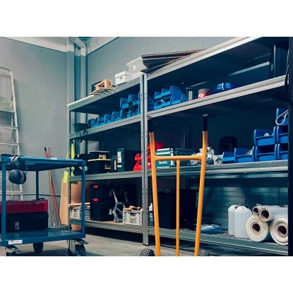 Das Ar-Shelving Bullrack-Rivet Schwerlast-Steckregal mit 4 Böden in der GröĂe von 200 cm x 200 cm x 60 cm aus verzinktem Stahl hat eine Belastungsgrenze von bis zu 450 kg je Boden. So sorgt dieses Regal ĂŒberall fĂŒr Ordnung, gerade dort, wo schwere GegenstĂ€nde aufbewahrt werden.