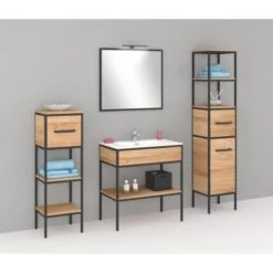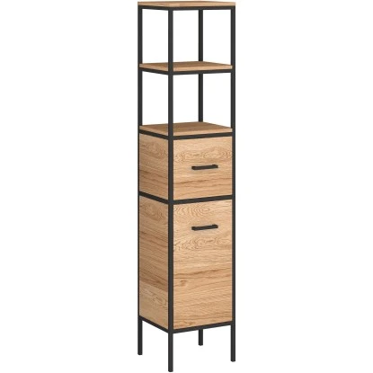 Der Astor Hochschrank Linus ist ein echter Eyecatcher. Durch die attraktive Verbindung von hellem Massivholz und mattschwarzem Metall verbreitet sich sofort ein WohlfĂĽhl-Ambiente in jedem Badezimmer.