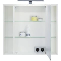 Der Astor Spiegelschrank Top II LED 65 cm in Weiß ist mit einer verchromten LED-Design-Aufsatzleuchte sowie integrierter Schalter Steckdosenkombination ausgestattet. Er verfügt zudem über eine praktische Spiegeltür, sechs offene Fächer und sechs Glas-Einlegeböden für besonders viel Stauraum.