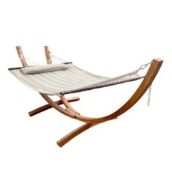 Die Axi Hängematte Hawaii Set mit Holzgestell ist die ideale Wahl für entspannte Stunden im Garten oder auf der Terrasse. Das Set besteht aus einer bequemen beigen Hängematte, die für zwei Personen geeignet ist, und einem stabilen Holzgestell aus witterungsbeständigem Lärchenholz. Mit dem praktischen Gestell können Sie die Hängematte überall aufstellen, ohne auf Bäume angewiesen zu sein. Das mitgelieferte Kissen sorgt für zusätzlichen Komfort beim Faulenzen.