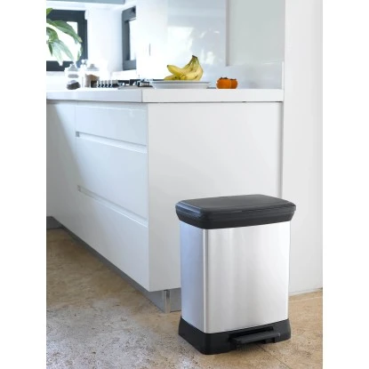 Der klassische Curver Decobin Mülleimer in rechteckiger Form mit Treteimerfunktion fasst 30 Liter und ist eine gute Wahl für kleine und mittelgroße Küchen.