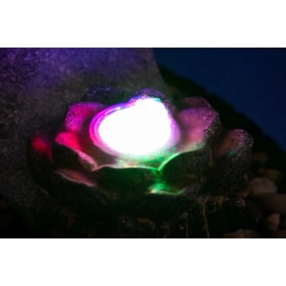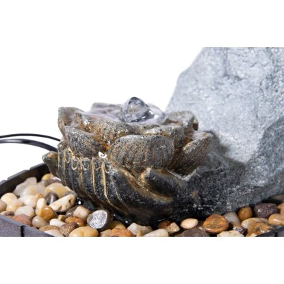 Das Wasser sprudelt aus der Blüte, in deren Inneren LEDs für herrliche Lichteffekte sorgen. Die Abdeckung der Kunststoff-Unterschale kann mit den mitgelieferten Kieselsteinen ausgelegt werden. So erzeugen Sie ein entspannendes Wohlfühlambiente, das Sie den Stress im Alltag vergessen lässt. Der Springbrunnen ist ca. 20,5 cm x 16,5 cm x 27 cm groß und hat einen Energieverbrauch von 2 W. Neben dem Brunnen sind 200 g Ziersteine, ein ca. 1,6 m langes Netzkabel inkl. Pumpe und eine ausführliche Bedienungsanleitung im Lieferumfang enthalten.