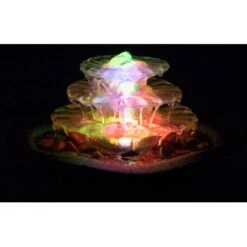 Der Springbrunnen ist ca. 23 cm x 23 cm x 15 cm groß und hat einen Energieverbrauch von 2 W. Neben dem Brunnen sind 200 g Ziersteine, ein ca. 1,6 m langes Netzkabel inkl. Pumpe und eine ausführliche Bedienungsanleitung im Lieferumfang enthalten.