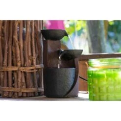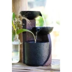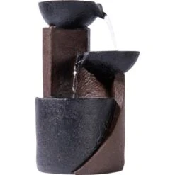 Der attraktive Dobar Zimmerbrunnen bringt das entspannende Rauschen und Plätschern des Wassers direkt in Ihr zu Hause und in Ihr Büro. Der 3-stufige Brunnen besteht aus leichtem und robustem Polyresin-Kunststein und verfügt über zwei kleine Wasserschalen, über die das Wasser in das Auffangbecken hinabfließt. Der braune Kunststein verleiht dem Wasserspiel einen eleganten Keramik-Look. So erzeugen Sie ein entspannendes Wohlfühlambiente, das Sie den Stress im Alltag vergessen lässt.