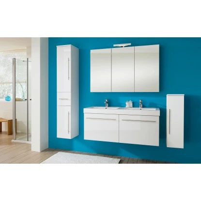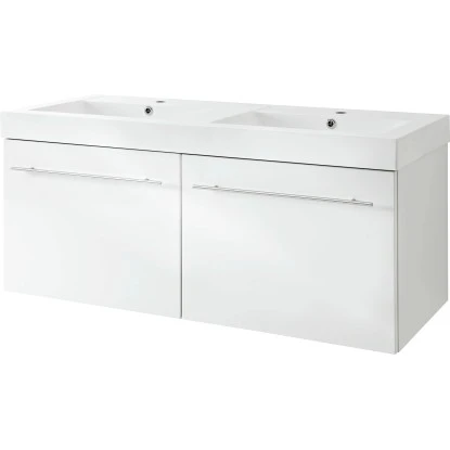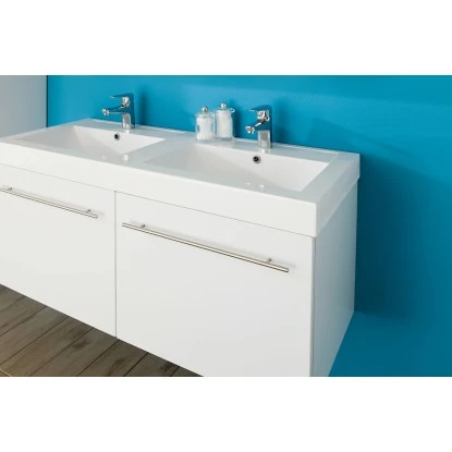 Der Doppelwaschplatz Albo mit weiß glänzenden MDF-Fronten ist mit einer hochwertigen Folie versehen.