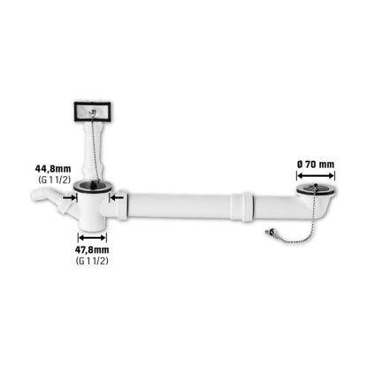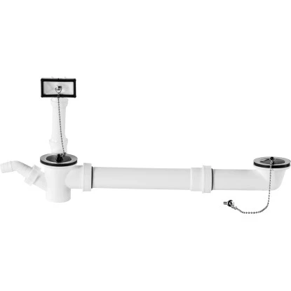In Küchen mit zwei Spülbecken kommt die variable Ab- und Überlaufgarnitur zum Einsatz. Sie dichtet zwei Abläufe, zwei Überläufe und den gemeinsamen Siphonanschluss zuverlässig ab. Ihre Länge ist – abhängig vom Abstand des Spülenanschlusses – flexibel von 15 cm bis 40 cm. Die integrierten Überlaufrohre werden an den beiden Spülen angebracht. Die Maße der Ablaufanschlüsse für die Spülbecken lauten 44,8 mm (G1 1/2), mit einem Durchmesser von 70 mm. Der gemeinsame Siphonanschluss verfügt über das Maß 47,8 mm (G 1 1/2). Bei dem Material handelt es sich um robustes, weißes PVC.
