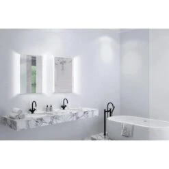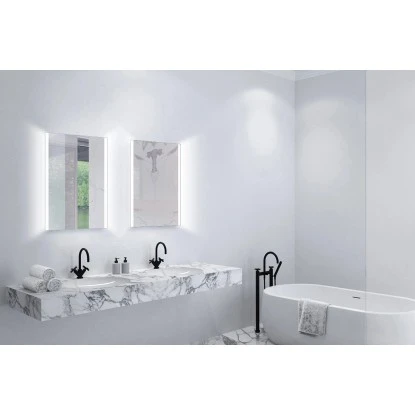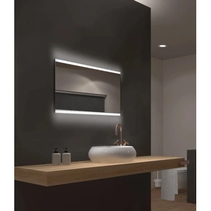Zwei sandgestrahlte, blendfreie LED-Lichtausschnitte fügen sich bündig in die Spiegeloberfläche ein und bilden eine einzigartige Kombination aus Designerspiegel und Badleuchte. Die Leuchten verfügen über die neueste LED-Technologie in einer Lichtfarbe von 4100 Kelvin und liefern 840 Lumen Helligkeit. Dank der energiesparenden Eigenschaften des beleuchteten Spiegels wird zudem die Umwelt und die Geldbörse geschont.