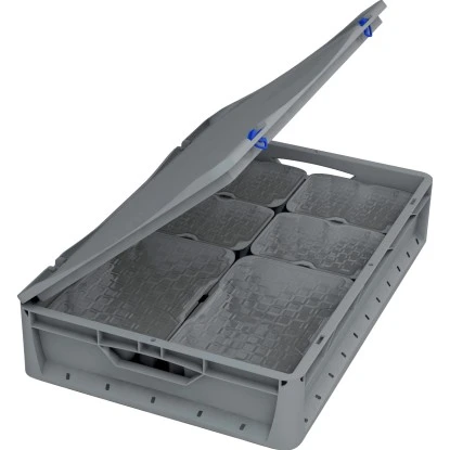 Das Euronorm Aufbewahrungsboxen-Set besteht aus einem Euronormbehälter, der mit 6 Einsatzkästen (4 x Achtel, 2 x Viertel) bestückt ist.