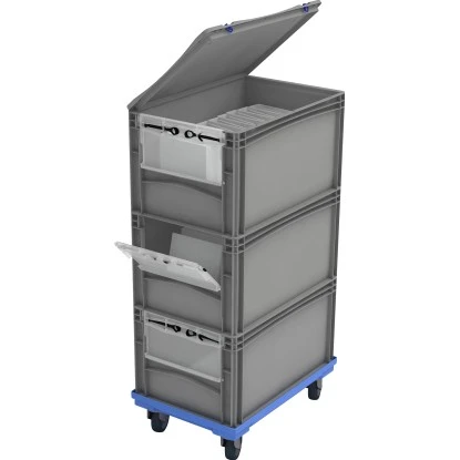 Die oberste Box des Euronorm Stautowers ist mit einem Scharnierdeckel verschlossen, um den Inhalt vor Staub und Dreck zu schützen. Für mehr Flexibilität und einen bequemen Transport sind alle Boxen übereinander auf einem Leichtlauf-Rollwagen gestapelt.
