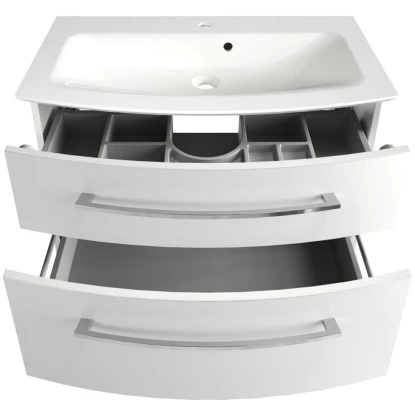 Be free – my style! Aus der Kombination dieser fröhlichen Lebenseinstellung generiert sich der Name des neuen Badmöbel-Programms von Fackelmann. Auch das 2-teilige Badmöbel-Set B.Style deckt mit fünf ansprechenden Dekorkombinationen viele Wünsche der modernen Badgestaltung ab. Das Set besteht aus einem Gussmarmor-Waschtisch mit eleganter Kantenführung in Weiß und einem passenden Waschtisch-Unterschrank. Ausgestattet mit zwei geräumigen Schubladen, von denen die obere zudem über ein integriertes Ordnungsfach verfügt, bietet dieser genügend Stauraum für Handtücher, Kosmetik und Zubehör.