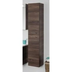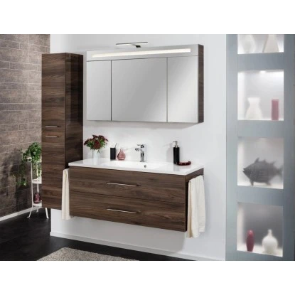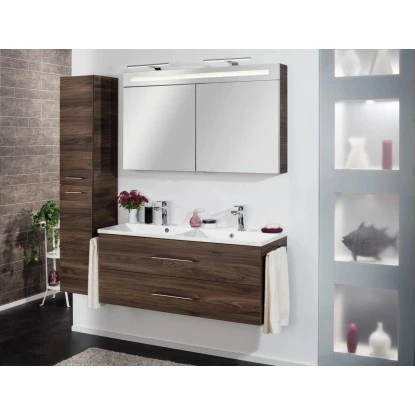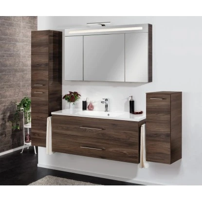 Die Fackelmann Badmöbelserie B.clever zeichnet sich durch modernes Design, attraktiven Dekoren und erstklassiger Qualität aus und bietet clevere Lösungen sowohl für kleine als auch für größere Bäder. Das Programm setzt für Korpus und Front das dunkle, edle Dekor Ulme Madera sowie die helle Alaska-Esche ein. Diese natürlichen Holznachbildungen bringen wohnliche Atmosphäre ins Bad und harmonieren perfekt zu hellen oder dunklen Fliesen und Accessoires. Ebenso erhältlich: das klassische Weiß in matt für den Korpus und Hochglanz-Ausführung für die Front. Als Griff kommt bei der Serie B.clever eine besonders designte Metallreling in chromglänzender Optik zum Einsatz.