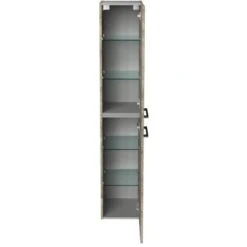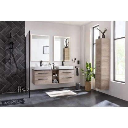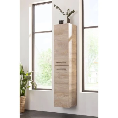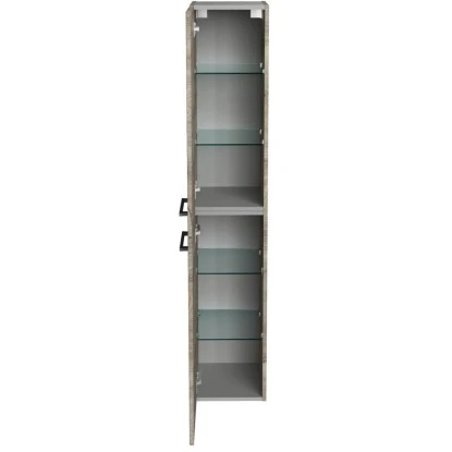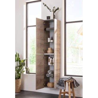 Spitzenmaterialien und eine edle Optik eröffnen neue Wege, um mit dem hängenden Fackelmann Hochschrank Oxford seinen eigenen Badezimmer-Stil zu verwirklichen. Als Möbeldekore stehen das markante Nature Oak (mit schwarzem Griff) und das klassische Weiß (mit verchromtem Griff) zur Auswahl. Der Korpus des Hochschranks ist aus zwei Teilen zusammengesetzt. Er ist mit einem festen und vier Glasablageböden ausgestattet und gewährt viel Stauraum für alle notwendigen Badutensilien.
