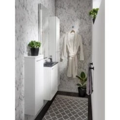 Die Badmöbelserie Luna wurde hängend konzipiert. Der Midischrank wird zerlegt geliefert und eignet sich zum einfachen Selbstaufbau.