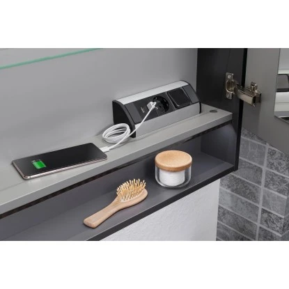 Im Inneren des Spiegelschranks befindet sich auch eine innovative Elektrobox mit Schalter, Steckdose und 2 USB-Steckern, die eine einfache Handhabung des Föns & Co. ermöglicht. Die zwei USB-Ports bieten Ihnen u.a. auch die Möglichkeit, das Handy oder die Elektrozahnbürste zu laden. Eine verchromte LED-Aufsatzleuchte über dem Spiegelschrank sorgt für optimale Lichtverhältnisse. Die zwei Türen des Spiegelschranks sind innen verspiegelt. Die Querteile und die Rückwand sind in neutralem Silbergrau gehalten.