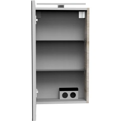 Immer mehr fungiert das GĂ€stebad als Visitenkarte des persönlichen Einrichtungsstils. Der Fackelmann Spiegelschrank ist Teil der Small Bathroom Collection (SBC), mit der Fackelmann sein bewĂ€hrtes Konzept fĂŒr die Vielfalt und das elegante Ambiente im GĂ€stebad neu ĂŒberdacht und optimiert hat. Der hĂ€ngend montierte Spiegelschrank begeistert mit zahlreichen ansprechenden Korpus- und Frontvarianten, die von WeiĂ ĂŒber Anthrazit bis hin zu diversen Holzdekoren reichen. Die Beleuchtung des Spiegelschranks mit eingebauter LED-Aufsatzleuchte steuert eine Elektrobox mit Schalter und Steckdose. Die TĂŒr links lĂ€sst sich ohne Griff öffnen. Im Inneren ist der Spiegelschrank mit 2 Glasablageböden ausgestattet, die 3 FĂ€cher ergeben, welche viel Stauraum fĂŒr alle notwendigen Badutensilien gewĂ€hren.