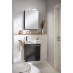 Immer mehr fungiert das Gästebad als Visitenkarte des persönlichen Einrichtungsstils. Der Fackelmann Spiegelschrank ist Teil der Small Bathroom Collection (SBC), mit der Fackelmann sein bewährtes Konzept für die Vielfalt und das elegante Ambiente im Gästebad neu überdacht und optimiert hat. Der hängend montierte Spiegelschrank begeistert mit zahlreichen ansprechenden Korpus- und Frontvarianten, die von Weiß über Anthrazit bis hin zu diversen Holzdekoren reichen. Die Beleuchtung des Spiegelschranks mit eingebauter LED-Aufsatzleuchte steuert eine Elektrobox mit Schalter und Steckdose. Die Tür links lässt sich ohne Griff öffnen. Im Inneren ist der Spiegelschrank mit 2 Glasablageböden ausgestattet, die 3 Fächer ergeben, welche viel Stauraum für alle notwendigen Badutensilien gewähren.