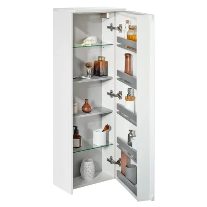 Der Fackelmann Unterschrank Magic wird mit dem edlen Design zu einem Hingucker in Ihrem Bad. Die 4 Einlegeböden, davon 2 aus Glas, sehen nicht nur toll aus, sondern bieten auch viel Stauraum für Ihre Bad- und Kosmetikartikel. In der Tür sind zusätzliche 5 Fächer zur sicheren Aufbewahrung von Flacons, Tuben und ähnlichem. Öffnen und schließen lässt sich der Schrank mit der in der Tür eingelassenen Griffmulde, wodurch das moderne Design nochmals unterstrichen wird.