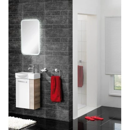 Immer mehr fungiert das Gästebad als Visitenkarte des persönlichen Einrichtungsstils. Der Fackelmann Waschbeckenunterschrank ist Teil der Small Bathroom Collection (SBC), mit der Fackelmann sein bewährtes Konzept für die Vielfalt und das elegante Ambiente im Gästebad neu überdacht und optimiert hat. Der hängend montierte Waschbeckenunterschrank begeistert mit zahlreichen ansprechenden Korpus- und Frontvarianten, die von Weiß über Anthrazit bis hin zu diversen Holzdekoren reichen. Die Tür links lässt sich mit einem edel anmutenden Metallgriff öffnen. Das Schrankinnere ist in neutralem Silbergrau gehalten. Alle notwendigen Badutensilien können auf einem Einlegeboden sicher und sauber verstaut verstaut werden.