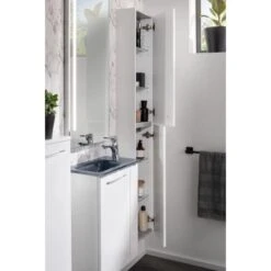 Darüber hinaus weisen alle Fackelmann-Schränke eine hochwertig verarbeitete Dickkante mit wasserfester, quellsicherer Verleimung auf und sind mit gedämpften Scharnieren und Schubladen mit Soft-Close-System für einen sanften Anschlag versehen. Korpusse und Fronten sind aus feuchtigkeitsresistenten Materialien gefertigt, stabil und pflegeleicht.