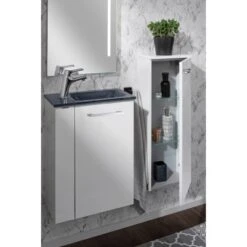 Immer mehr fungiert das Gästebad als Visitenkarte des persönlichen Einrichtungsstils. Der Fackelmann Waschbeckenunterschrank ist Teil der Small Bathroom Collection (SBC), mit der Fackelmann sein bewährtes Konzept für die Vielfalt und das elegante Ambiente im Gästebad neu überdacht und optimiert hat. Der hängend montierte Waschbeckenunterschrank begeistert mit zahlreichen ansprechenden Korpus- und Frontvarianten, die von Weiß über Anthrazit bis hin zu diversen Holzdekoren reichen. Die Tür rechts lässt sich mit einem edel anmutenden Metallgriff öffnen. Das Schrankinnere ist in neutralem Silbergrau gehalten. Alle notwendigen Badutensilien können auf einem Einlegeboden sicher und sauber verstaut verstaut werden.