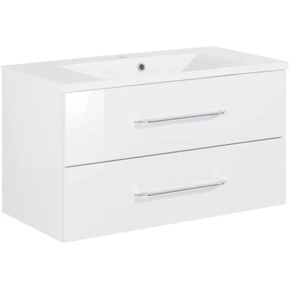 Der Waschbeckenunterschrank sorgt mit seinem klassischen Weiß für einen schicken Akzent in Ihrem Badezimmer. Der Korpus ist mit mattem Weiß ausgestattet, während die Front in Hochglanz-Weiß gestaltet ist. Der Unterschrank ist gemeinsam mit dem Waschtisch hängend konzipiert und wird zerlegt zum einfachen Selbstaufbau geliefert. Die modernen Metall-Griffe des Waschbeckenunterschranks sind in chromglänzender Optik gestaltet. Beide geräumigen Schubladen verfügen über integrierte Soft-Close-Systeme für schonenderes Schließen. Der Unterschrank ist feuchtigkeitsresistent, wodurch das Badmöbel auch sehr pflegeleicht ist. Die Kanten des Waschbeckenunterschranks sind hochwertig verarbeitet und weisen eine Dickkante mit feuchtigkeitsresistenter PU (Polyurethan) – Verleimung auf.