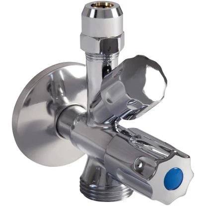 Dieses verchromte Geräte-Kombi-Eckventil ersetzt das handelsübliche Eckventil zwecks Anschluss einer Wasch- oder Geschirrspülmaschine. Es ist zusätzlich mit einem Rückflussverhinderer ausgestattet. Mit dem beigelegten 3/8 x 10 mm Quetschüberwurf kann es universell mit einem Flex-Armaturenanschlussschlauch (3/8 IG oder 10 mm Stutzen) oder mit einem starren Röhrchen angeschlossen werden. Der Wandanschluss beträgt 1/2 und der Anschluss für die Geräte 3/4.