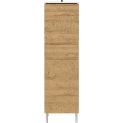 Um das Badezimmer oder Gäste-WC in eine wahre Wellness-Oase zu verwandeln, eignen sich die Möbel aus diesem Badprogramm perfekt. Dank seiner Korpusse in Weiß und Fronten in Eiche überzeugt das Programm mit seiner Gemütlichkeit und natürlichen Optik. Grifflose Fronten setzen die Möbel perfekt in Szene und sorgen für ein hohes Maß an Modernität. Darüber hinaus geben hohe und zugleich schmale Füße aus Metall in der Farbe Silber den Standelementen eine gewisse Leichtigkeit.