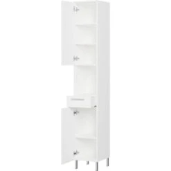 Der hier gezeigte Germania Hochschrank 8298 ist mit einer Schublade, zwei Türen und einem offenen Fach ausgestattet. Türen und Schubladen schließen durch integrierten Dämpfer langsam, sanft und geräuschlos. Hinter den Türen befinden sich drei verstellbare Einlegeböden, die es Ihnen erlauben das Möbel an Ihre individuellen Bedürfnisse anzupassen. Die Fronten des Möbels sind aus MFD gefertigt. Die Oberfläche ist supermatt und bildet somit einen perfekten Kontrast zu den glänzenden Griffen und Füßen.