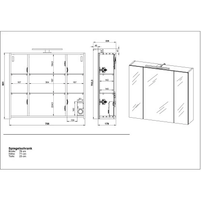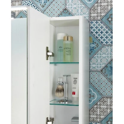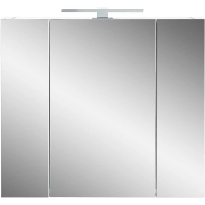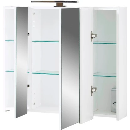 Der Spiegelschrank 2754 ist dank seiner Maße besonders platzsparend und eignet sich somit auch gut für kleine Räume (z. B. Gäste-WC). Insgesamt verfügt der reinweiße Spiegelschrank über drei verspiegelte Türen, die die Spiegelfläche des Schranks bilden. Hinter den gedämpften Türen bietet der Schrank dank seiner sechs Glasböden jede Menge Stauraum. Dort können Sie ganz bequem Ihre Kosmetikartikel, Pflegeprodukte und weiteren Badutensilien unterbringen.