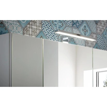 Für den täglichen Gebrauch von Haartrockner, Rasierer und elektrischer Zahnbürste ist bereits eine Steckdose eingebaut. Oberhalb des Spiegelschranks ist eine Lampe angebracht, die das Möbel perfekt ausleuchtet.