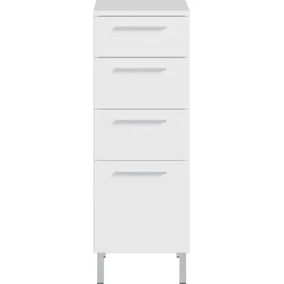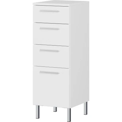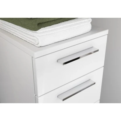 Das moderne, gradlinige Badezimmer-Programm ist ein echter Blickfang für jeden Nassbereich. Die edlen, weißen Möbel, deren Charakter durch schlanke Steggriffe aus Metall in der Farbe Chrom unterstrichen wird, lassen sich sowohl im Masterbad, als auch im Gäste-WC gekonnt platzieren. Besonderes Highlight: Die hohen Füße aus Chrom in der Farbe Silber geben den Standelementen eine gewisse Leichtigkeit.