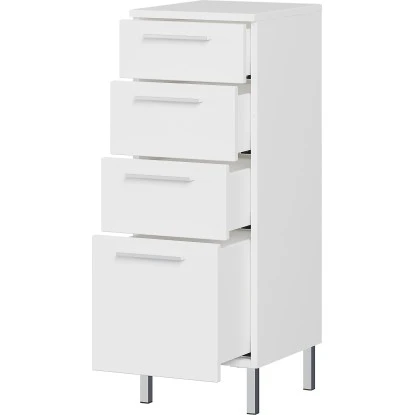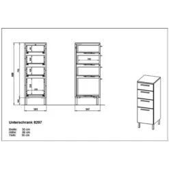 Der Germania Unterschrank 8297 ist mit vier Schubladen ausgestattet. Alle verfügen über integrierte Dämpfer, so dass die Schubladen langsam, sanft und geräuschlos schließen. Oberboden und Fronten des Möbels sind aus MFD gefertigt. Die Oberfläche ist supermatt und bildet somit einen perfekten Kontrast zu den glänzenden Griffen und Füßen.