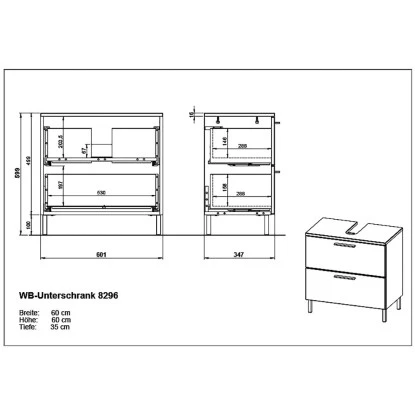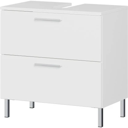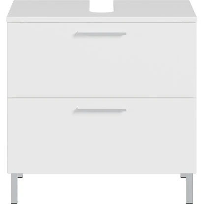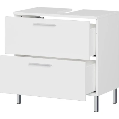 Der Waschbeckenunterschrank 8296 von Germania ist mit zwei Schubladen ausgestattet. Beide verfügen über integrierten Dämpfer, so dass die Schubladen langsam, sanft und geräuschlos schließen. Die praktische Aussparung für den Siphon ermöglicht es Ihnen, den Selbigen einfach im Möbel verschwinden zu lassen. Oberboden und Fronten des Möbels sind aus MFD gefertigt. Die Oberfläche ist supermatt und bildet somit einen perfekten Kontrast zu den glänzenden Griffen und Füßen.