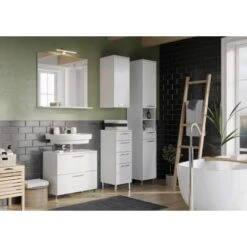 Das moderne, gradlinige Badezimmer-Programm ist ein echter Blickfang für jeden Nassbereich. Die edlen, weißen Möbel, deren Charakter durch schlanke Steggriffe aus Metall in der Farbe Chrom unterstrichen wird, lassen sich sowohl im Masterbad, als auch im Gäste-WC gekonnt platzieren. Besonderes Highlight: Die hohen Füße aus Chrom in der Farbe Silber geben den Standelementen eine gewisse Leichtigkeit.