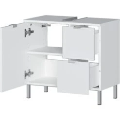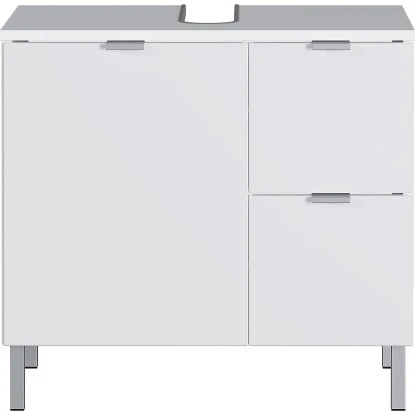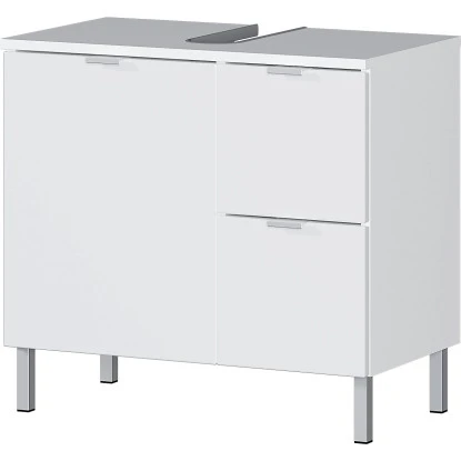 Der Waschbeckenunterschrank 8529 von Germania ist mit zwei Schubladen und einer Tür ausgestattet. Die Türen und Schubladen schließen durch integrierten Dämpfer langsam, sanft und geräuschlos. Mit seinen Maßen findet der Schrank spielend Platz unter jedem Waschbecken. Die Aussparung für den Siphon lässt diesen geschickt im Innenraum des Möbels verschwinden. Der verstellbare Einlegeboden erlaubt es Ihnen das Möbel an Ihre individuellen Bedürfnisse anzupassen, so dass Waschutensilien und Handtücher ihren Platz finden.