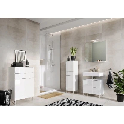 Um das Badezimmer oder Gäste-WC in eine wahre Wellness-Oase zu verwandeln, eignen sich die Möbel aus diesem Programm perfekt. Durch verschiedene Farbvarianten passt sich dieses Bad-Programm jedem Einrichtungsstil an. Gemütlich und freundlich überzeugt die Variante in Grandson-Eiche mit Hochglanzfronten in Weiß. Besonders modern kommt die Variante in komplett in Weiß daher. Die edlen weißen Fronten mit Hochglanz-Oberfläche sind mit Kantengriffen in der Farbe Chrom versehen. Auch die Füße der Standmodelle sind aus Metall und in der Farbe Chrom.