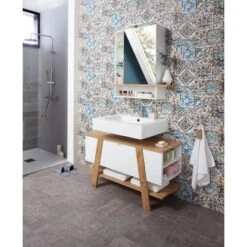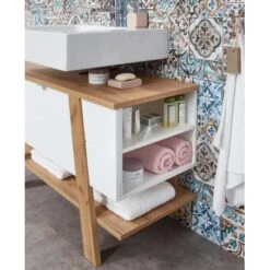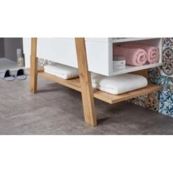 Mit diesem Waschbeckenunterschrank schwappt eine Welle der Entspannung in Ihr Badezimmer. Formschöne Möbel sorgen hier für ein zeitloses und modernes Auftreten. Das liegt auch an der Farbkombination aus Fronten in supermattem Weiß und Akzenten in Navarra-Eiche-Nb., die den Möbeln einen skandinavischen Look verleihen. Dieser strahlt eine große Portion Wärme und Gemütlichkeit aus – genau das richtige für die Wellness-Oase in den eigenen vier Wänden.