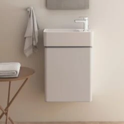 Wandhängend setzt sich der Waschtischunterschrank in Szene. Das entsprechende Befestigungsmaterial ist dabei bereits im Lieferumfang enthalten.