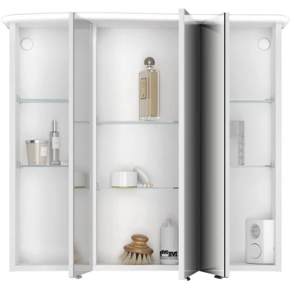 Der Badezimmerschrank verfügt über drei Spiegeltüren aus hochwertigem Kristallglas. Durch das angewinkelte Design entsteht ein 3D-Spiegeleffekt. Dank der Design-LED-Beleuchtung werden die Spiegel jederzeit perfekt ausgeleuchtet. Zudem ist die Beleuchtung sehr energiesparend. Der Jokey Spiegelschrank besitzt außerdem eine Schalter-Steckdosen-Kombination. Die innenliegenden Glaseinlegeböden können Sie nach Ihren Wünschen anbringen. So sind Ihre Badezimmerutensilien gut und ordentlich verstaut.