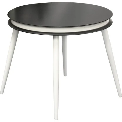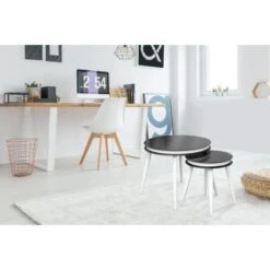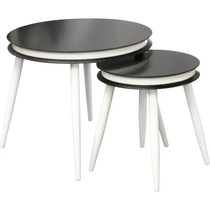 Die Kayoom Beistelltische Suri Tische können ineinander geschoben werden, so sind sie besonders platzsparend und praktisch. Die runden tablettförmigen Tischplatten bilden das optische Highlight und bieten eine großzügige Ablagefläche. Die MDF-Tischplatten sind mit einer Glanzbeschichtung überzogen, die für eine glatte, dekorative und gleichzeitig