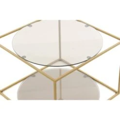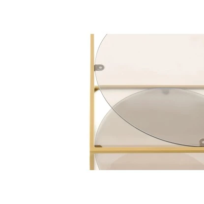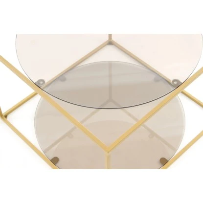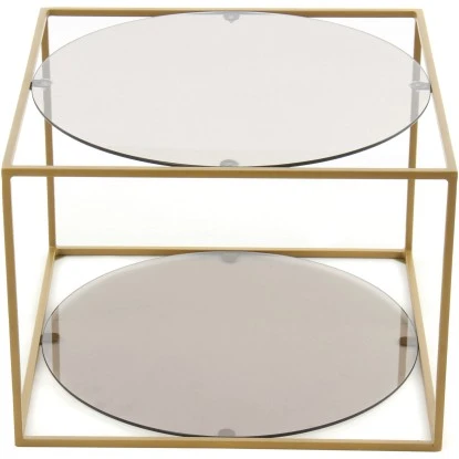 Bei dem Kayoom Beistelltisch Cody stehen das Gestell und die Tischplatten in absoluter Harmonie miteinander. Das offene Metallgestell in goldener Würfelform ist nicht nur mit einer grauen Tischplatte, sondern auch mit einer gleichfarbigen Bodenplatte aus Glas ausgestattet, sodass der Couchtisch bequem als Dekofläche und Ablagefläche gleichzeitig genutzt werden kann. Durch die runde Form der eingelassenen Platten wird das Konzept geometrischer Formen beibehalten und gleichzeitig ein Kontrast zu dem eckigen Gestell erzeugt.