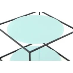 Bei dem Kayoom Beistelltisch Cody stehen das Gestell und die Tischplatten in absoluter Harmonie miteinander. Das offene Metallgestell in schwarzer Würfelform ist nicht nur mit einer grünen Tischplatte, sondern auch mit einer gleichfarbigen Bodenplatte aus Glas ausgestattet, sodass der Couchtisch bequem als Dekofläche und Ablagefläche gleichzeitig genutzt werden kann. Durch die runde Form der eingelassenen Platten wird das Konzept geometrischer Formen beibehalten und gleichzeitig ein Kontrast zu dem eckigen Gestell erzeugt.