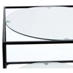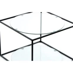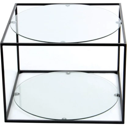 Bei dem Kayoom Beistelltisch Cody stehen das Gestell und die Tischplatten in absoluter Harmonie miteinander. Das offene Metallgestell in schwarzer Würfelform ist nicht nur mit einer klaren Tischplatte, sondern auch mit einer gleichfarbigen Bodenplatte aus Glas ausgestattet, sodass der Couchtisch bequem als Dekofläche und Ablagefläche gleichzeitig genutzt werden kann. Durch die runde Form der eingelassenen Platten wird das Konzept geometrischer Formen beibehalten und gleichzeitig ein Kontrast zu dem eckigen Gestell erzeugt.