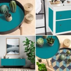 Alle Folien aus der Vénilia Greenline Serie bestehen aus 100% recyceltem Plastik. Sie enthalten keine schädlichen Weichmacher und werden in der EU produziert. Ob Pastellfarben, Materialoptik oder schlichte Naturfarben – hier ist für jeden Geschmack das passende Design dabei. Mit den Dekorfolien Vénilia lassen sich nicht nur Möbel upcyceln, sie eignen sich auch perfekt für Bastelarbeiten und Verschönerungen jeder Art. Die 95my starken Klebefolien sind robust, leicht anzubringen, abwischbar und hitzeresistent. Sie eignen sich ideal zum Basteln und Bekleben von Möbeln und Oberflächen aller Art, wie z. B. Tabletts, Schmuckkästen, Glas, Kartons. Sie sehen nicht nur schön aus, sondern sorgen dank ihrer wasser- und schmutzabweisenden Eigenschaft auch für pflegeleichte Möbel. Damit das Projekt gelingt, ist es ratsam, folgende Hilfsmittel griffbereit zu haben: Unterlage, Schere oder Stanley Messer/Cutter (die Klinge sollte scharf sein, damit die Kanten besonders schön und genau werden!), Lineal und zum Glattstreichen eine Rakel (gibt es auch von Vénilia als Zubehör Set). Die Oberflächen müssen sauber, trocken und fettfrei sein. Eine Reinigung mit einfachem Spüli und Wasser ist meistens ausreichend. Nach dem Trocken kann es losgehen! Natürlich können auch raue Oberflächen beklebt werden – Gips, Zement und Sperrholz sollten aber zuvor mit einem Lack oder Anstrich versehen werden. Als nächstes die Fläche ausmessen, die beklebt werden soll und die Folie passend zuschneiden. Für eine Fläche mit Aussparungen kann eine Vorlage aus Zeitungspapier oder Karton erstellt werden. Diese wird auf die Folienrückseite gelegt und als genaue Form übertragen und ausgeschnitten. Auf der Rückseite der Klebefolie ist ein aufgedrucktes Raster, das beim Abmessen und Zuschneiden hilft. Ein ideales Ergebnis erzielen Sie, wenn Sie bei Raumtemperatur arbeiten. Ziehen Sie die Schutzfolie ein Stück ab und positionieren Sie den Rand vorsichtig. Nun können Sie die Folien langsam Stück für Stück glattstreichen – das funktioniert am besten mit einer Rakel. Nachdem Sie die Folie positioniert haben, beträgt die Fixierungszeit 20 Minuten. In dieser Zeit können Sie Folie noch umkleben, falls sie nicht richtig sitzt oder Luftblasen entstanden sind. Nach der Fixierungszeit hält die Folie. Und wenn Ihnen nach erneuter Veränderung ist – können Sie die Folie einfach wieder abmachen!