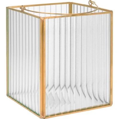 Die eckige Laterne aus der Trendserie Modern Antique dient als Dekoelement und Blickfang im Wohnraum. Mit einer passenden Kerze bestückt sorgt sie für ein stimmungsvolles Ambientelicht. Das oben offen gestaltete Windlicht besitzt die Maße 17 cm x 14 cm x 14 cm (H x B x T). Es besteht aus einem goldfarbenen Metallrahmen sowie einer Wandung aus transparentem Strukturglas. Ausgestattet ist die Dekolaterne zudem mit einem Bügel, über den sie sich auch aufhängen lässt. Sie kann beliebig mit weiteren Stilelementen aus der Serie kombiniert werden.