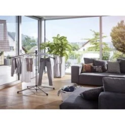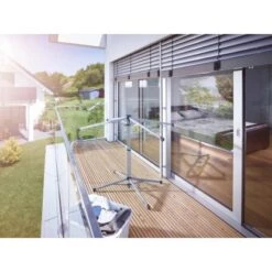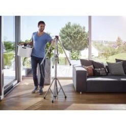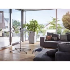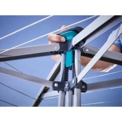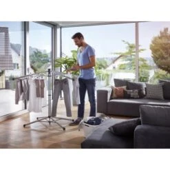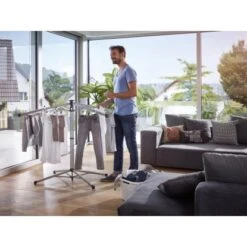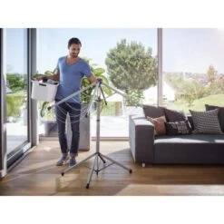 Die Leinen sind von innen nach außen leicht abfallend angeordnet, sodass man problemlos jede Leine erreicht. Mit einer Höhe von 95 cm bietet selbst die äußerste Leine die Möglichkeit lange Wäschestücke wie beispielsweise Badehandtücher oder Hosen zu trocknen. Dabei sorgen die stabilen Leinenarme und die breite Aufstellfläche, auch voll beladen, für einen sicheren Stand. Durch Druck auf den Bediengriff lassen sich die Leinen einfach und bequem nachspannen.