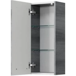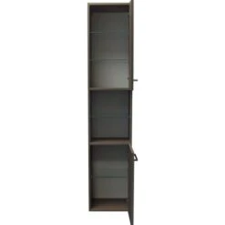 Hinter der Tür mit schwarzem Metallgriff verbirgt sich viel Stauraum, wo all Ihre Badartikel und Kosmetikutensilien Ihren Platz finden. Der Hochschrank verfügt über ein Soft-Close-System, welches ein einfaches und geräuschloses Schließen der Tür ermöglicht. Die höhenregulierbaren Glaseinlegeböden haben eine große Ablagefläche.