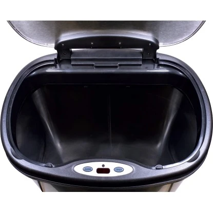 Der Mülleimer mit moderner Infrarot-Technologie zeichnet sich durch seine besonders praktische sowie hygienische Abfallentsorgung aus und erspart das Berühren des Deckels. Stattdessen öffnet sich der Deckel automatisch bei Annäherung und schließt nach 5 Sekunden. Um den Deckel für eine längere Zeit zu öffnen, sind die Hände in Sensor-Reichweite zu halten oder die „Open“-Taste zu drücken. Er verfügt über einen Spannring zum Befestigen von Müllsäcken am Abfalleimer. Das Fassungsvermögen beträgt 50 l und ist für standardmäßige Müllbeutel von bis zu 50 l bis 60 l geeignet. Die Maße des Abfalleimers sind 68,5 cm x 39 cm x 25 cm (H x B x T). Mit seinem Gehäuse aus Edelstahl verleiht er eine moderne Optik und ist zudem leicht zu reinigen. Fingerabdrücke sind einfach mit einem angefeuchteten Tuch zu entfernen. Der Fußständer besteht aus schwarzem Kunststoff und verhindert ein Verkratzen des Bodens. Die 3 x C Batterien sind separat erhältlich.
