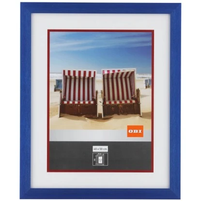 Der moderne OBI Kunststoffrahmen mit dem Alu-Look. Der Rahmen fasst ein Bild mit dem Format 40 cm x 50 cm, kann aber durch den angestanzten Passepartouteinleger auf eine Größe von 30 cm x 40 cm reduziert werden. Der Rahmen kann dekorativ an der Wand montiert werden.