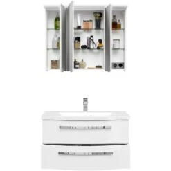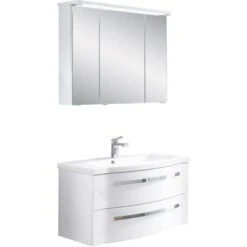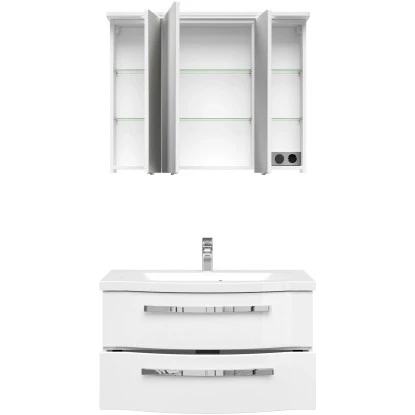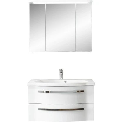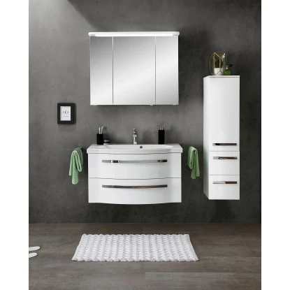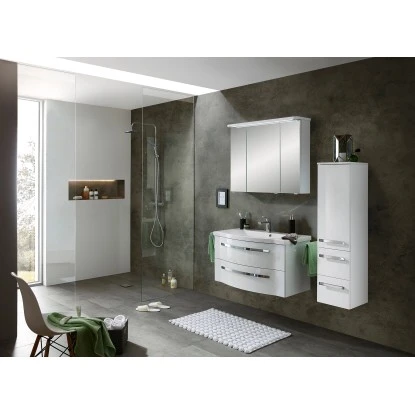 Das 3-teilige Pelipal Badmöbel-Set Fokus 4005 zeichnet sich durch edles Design und hohe Funktionalität aus. Das Set, bestehend aus einem elegant geschwungenen Waschbeckenunterschrank, einem hochwertigen Mineralmarmor-Waschtisch und einem Spiegelschrank, lässt sich mit seinen Fronten in zeitlosem, polarweißem Hochglanz Lack in beinahe jede Stilrichtung integrieren. Die Bügelgriffe in Chrom Glanz unterstreichen die lackierte Front und setzen klare Akzente in Ihrem Badezimmer. Die äußerst sparsame LED-Beleuchtung sorgt für optimale Lichtverhältnisse beim Schminken, Rasieren oder Frisieren.